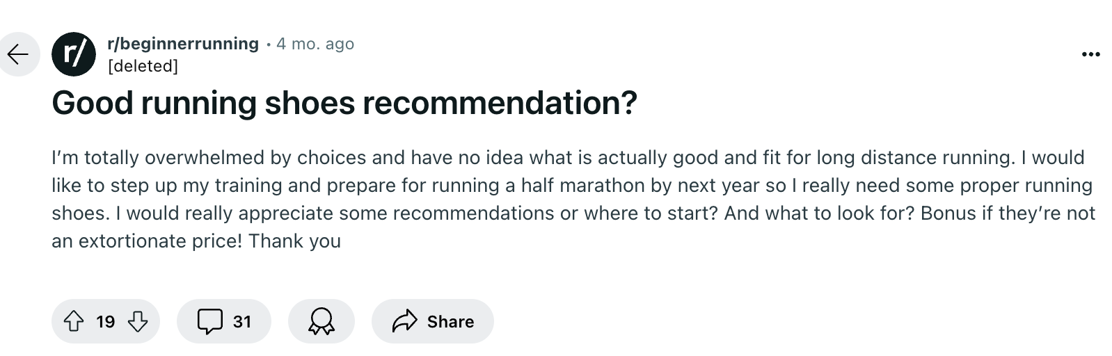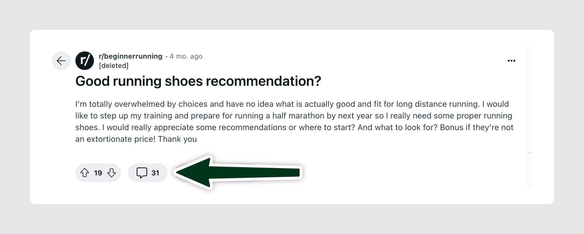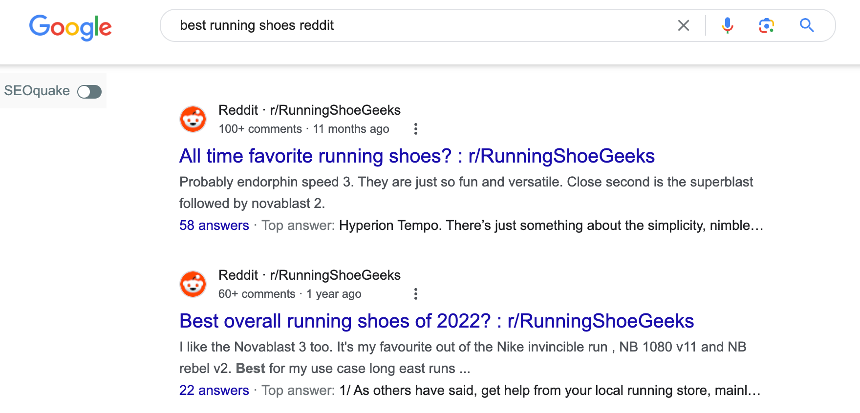 For example, if you launched a new brand of running shoes it would go along the lines of: "Best running shoes Reddit" or "Alternative to Nike shoes for running Reddit".