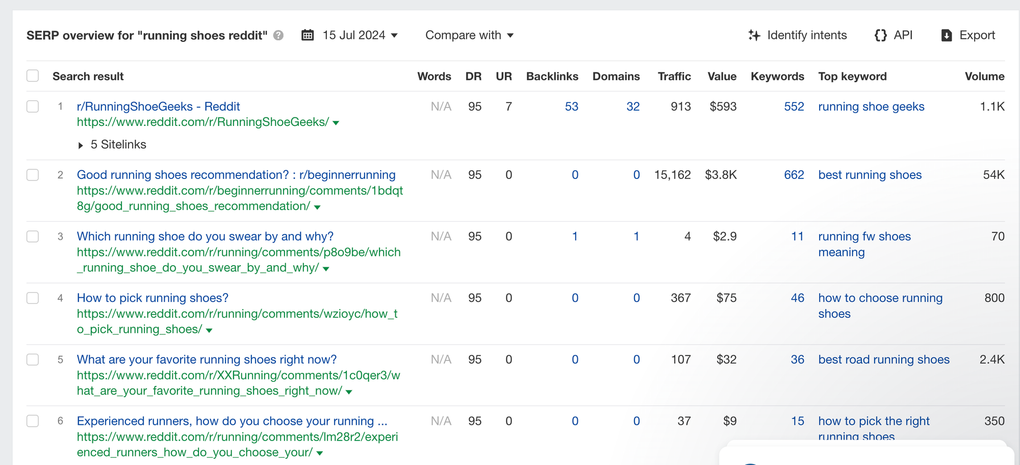 As a result, those Reddit posts have high traffic volume. Here are the results for the search term "top running shoes Reddit" on Ahrefs (July 2024).